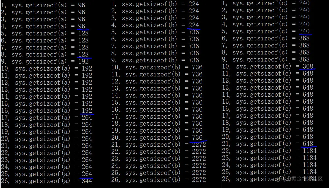 以上的可变对象在扩充时,有相似的分配机制,在动态扩容时可明显看出效果。