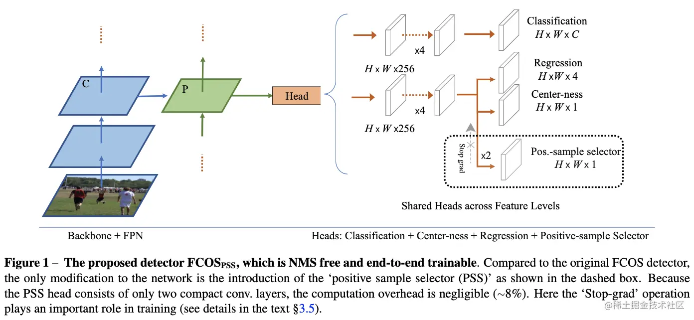 当前主流的目标检测算法训练时大都一个GT对应多个正样本,使得推理时也会多个输出对应一个目标,不得不对结果进行NMS过滤。而论文的目标是设计一个简单的高性能全卷积网络,在不使用NMS情况下,能够进行完全的端到端训练。论文提出的方法十分简单,核心在于添加一个正样本选择分支(positive sample selector, PSS)。