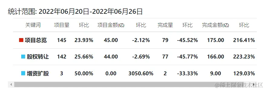 主要对项目总览、股权转让、增资扩股进行汇总,从项目量、项目金额、完成量、完成金额等维度出发,并做了环比计算。详情如下图:
