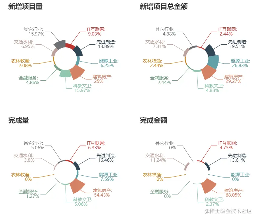 塔米周报按照行业对新增项目量、新增项目总金额、完成项目量、完成项目金额进行了统计并可视化展示。