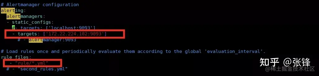 3.7 在 Prometheus 中配置 Alertmanager 模块需要在 Prometheus 的安装目录下的 prometheus.yml 文件中加入 Alertmanager 通信地址和端口号,同时配置 alert rules 目录,该目录主要存放配置的报警规则。