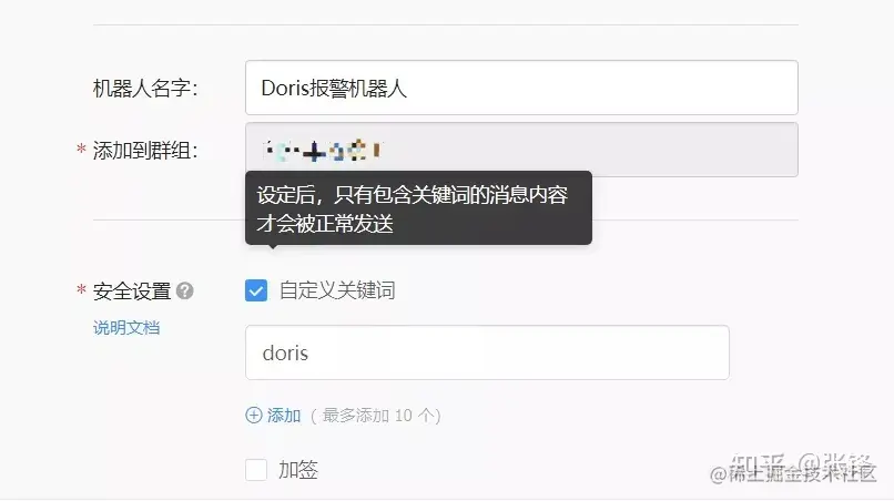 4.2 在钉钉群配置机器人配置机器人时,需要添加自定义关键词,这个关键词后期在配置规则报警信息时,也同样需要出现,不然无法发送报警。