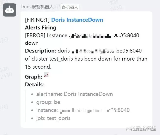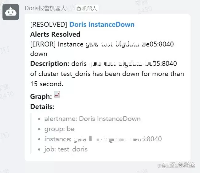 当 Doris 集群中的 instance 出现 down 机后,钉钉群里新建的机器人会发出报警信息。