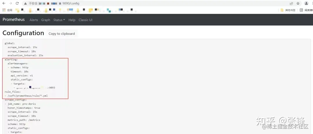 重启成功后,可以通过:http://localhost:9090/config查看 alerting 配置是否生效。