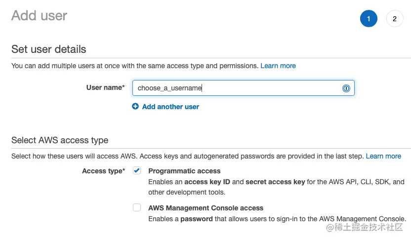 在侧边栏点击 "用户",然后 "添加用户"。启用 "程序化访问"。