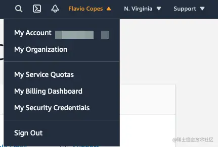 一旦你设置了一个账户,并且你登录了AWS,点击上面的名字,然后点击 "我的安全证书"