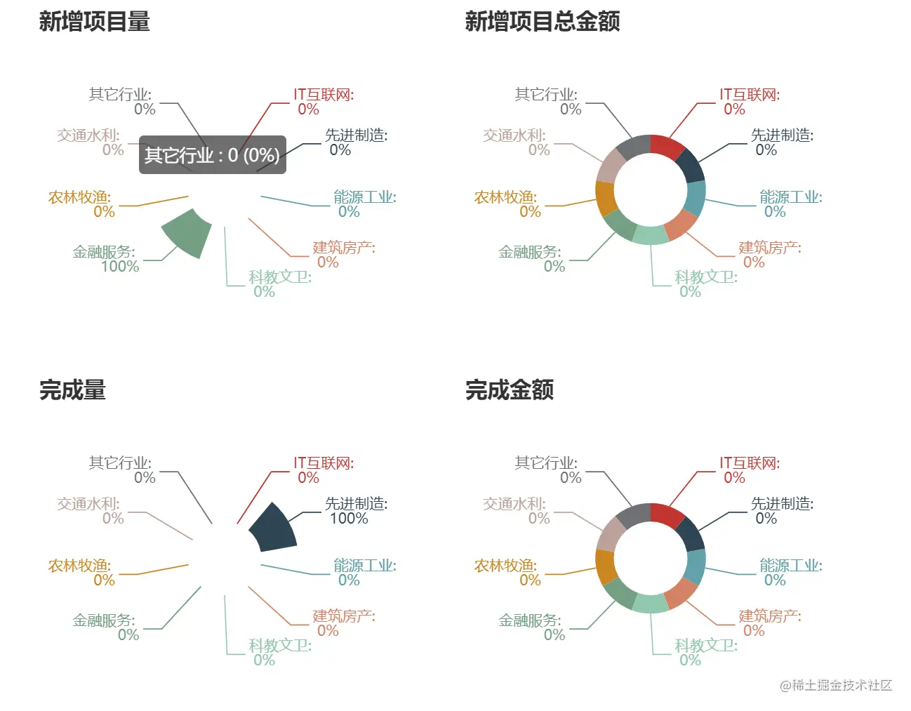 塔米周报按照行业对新增项目量、新增项目总金额、完成项目量、完成项目金额进行了统计并可视化展示。