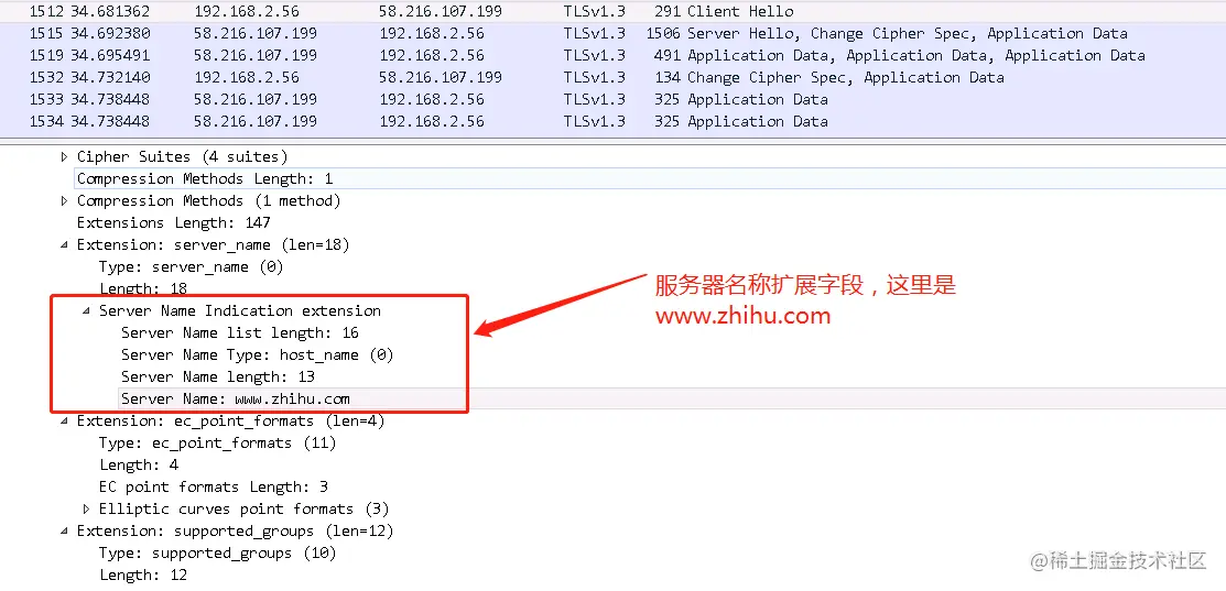 调用该函数后会在ClientHello的扩展字段中增加一个Server Name字段。如下图所示: