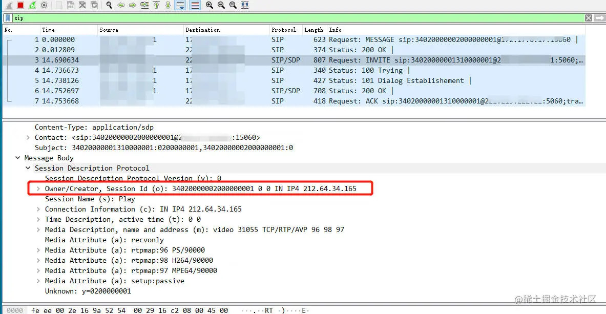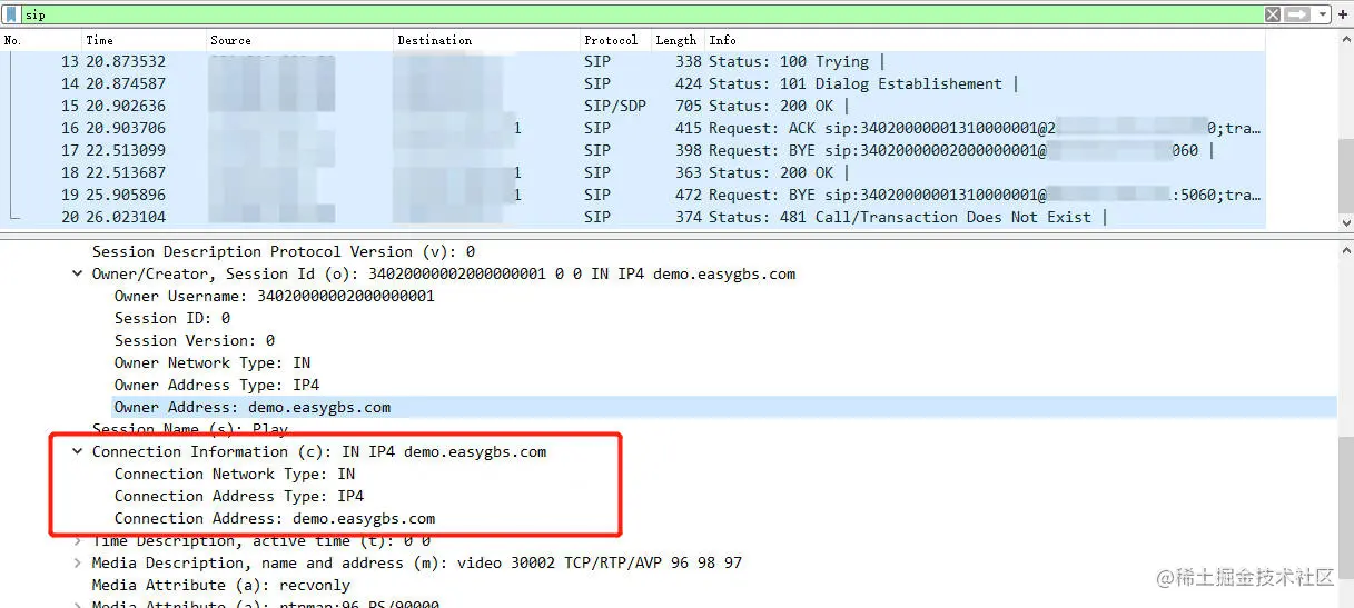 对比Invite消息发现,在Message Bady sdp.owner.address为域名时,设备就不发流数据,当sdp.owner.address为IP时,这个设备就能正常发流数据。于是针对这个细节进一步排查,原来是该设备不支持域名解析,所以当sdp.owner.address为域名时,设备自然就没有办法发送流数据到收流服务器了。以下是invite消息对比: