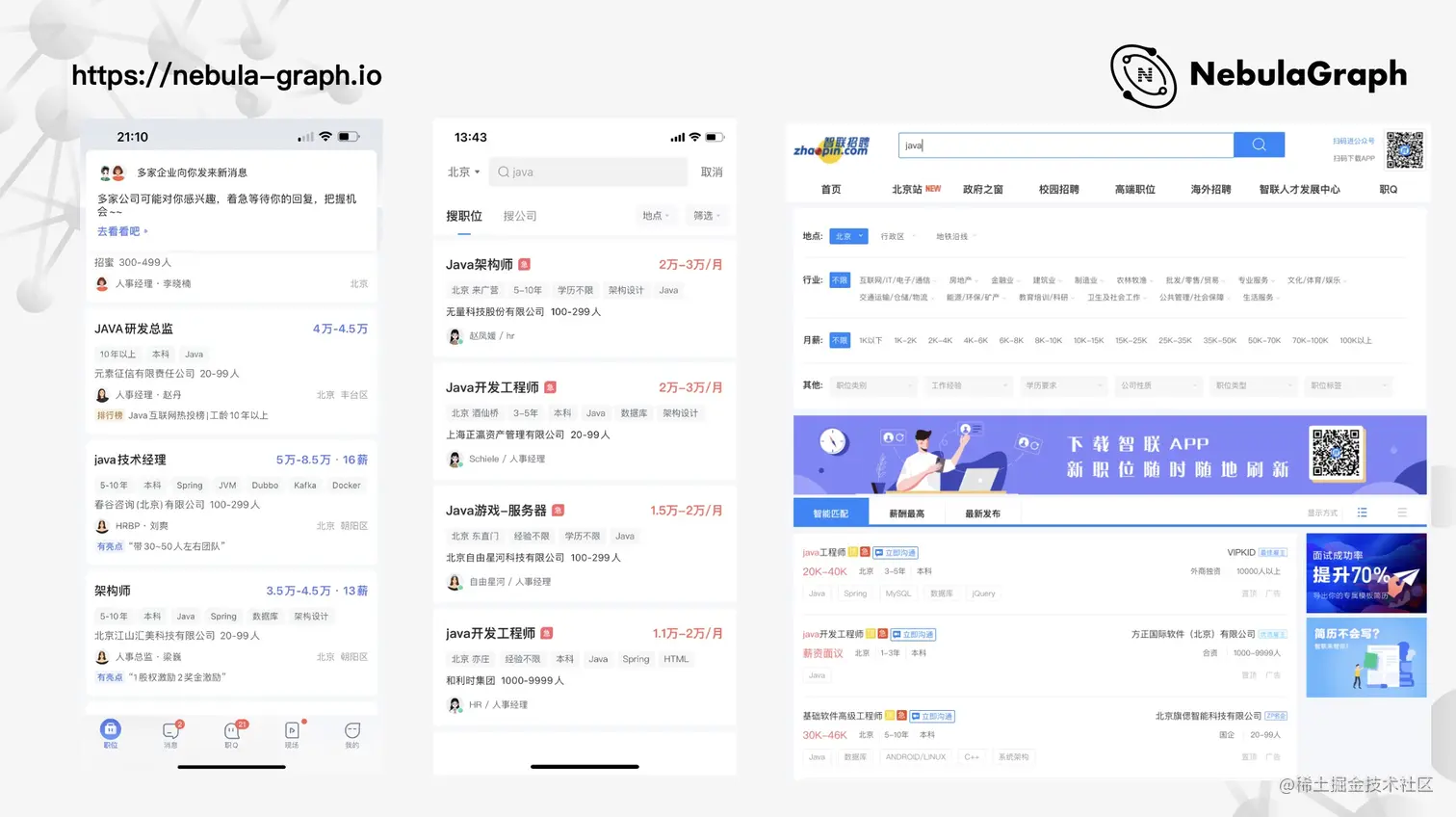 经过我们调研,业界对 Nebula Graph 评价挺高,智联这边用了 Nebula Graph 来实现图索引。像刚在 U2U 和 U2I 的场景,通过图的方式把 CV 和 JD 存储成点,边则存储关系。至于属性过滤,如上图所示将 JD 诸如所在城市、学历要求、薪资要求、经验要求等属性存储为点的属性;而相关性的话,则在关系边上存了一个“分”,最终通过分进行相关性排序。