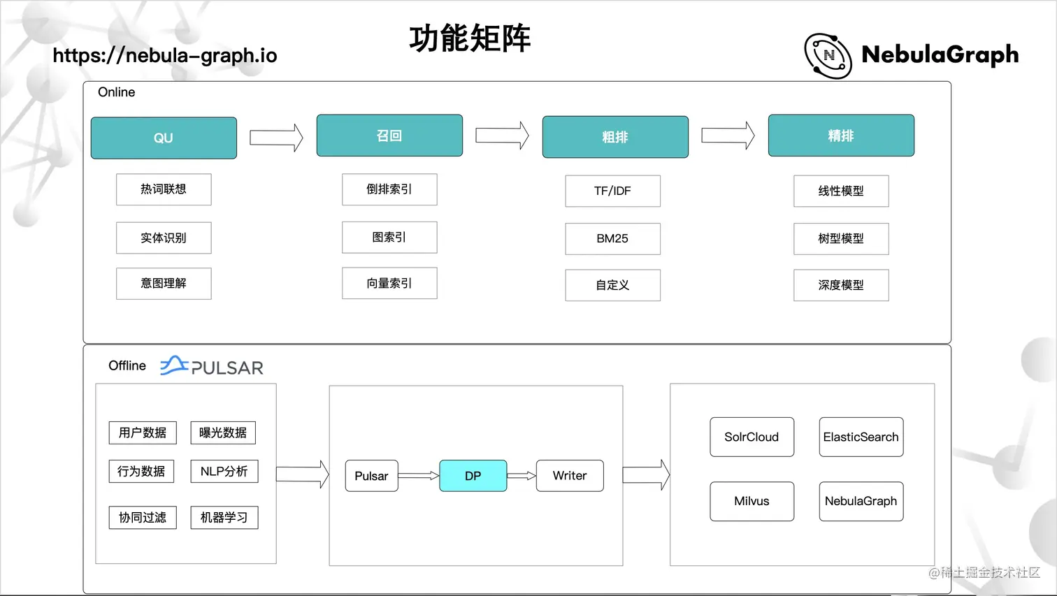 在 Online 部分,主要涉及到实时操作,例如:搜索某个关键词、实时展示个人推荐。而这些功能性操作需要其他功能支持,比如:热词联想,以及根据特定的输入进行实体识别、意图理解,或是个人用户画像的绘制。再下一步操作便是召回,利用倒排索引,根据文本、相似度匹配,以及引入 Nebula Graph 实现图索引、向量索引,都是为了解决召回问题。最后,便是搜索结果的展示——如何排序。这里会有个粗排,比如常见的排序模型 TF/IDF,BM25,向量的余弦相似 等召回引擎排序。粗排后面是精排,即:机器学习的排序,常见的有线性模型、树型模型、深度模型。