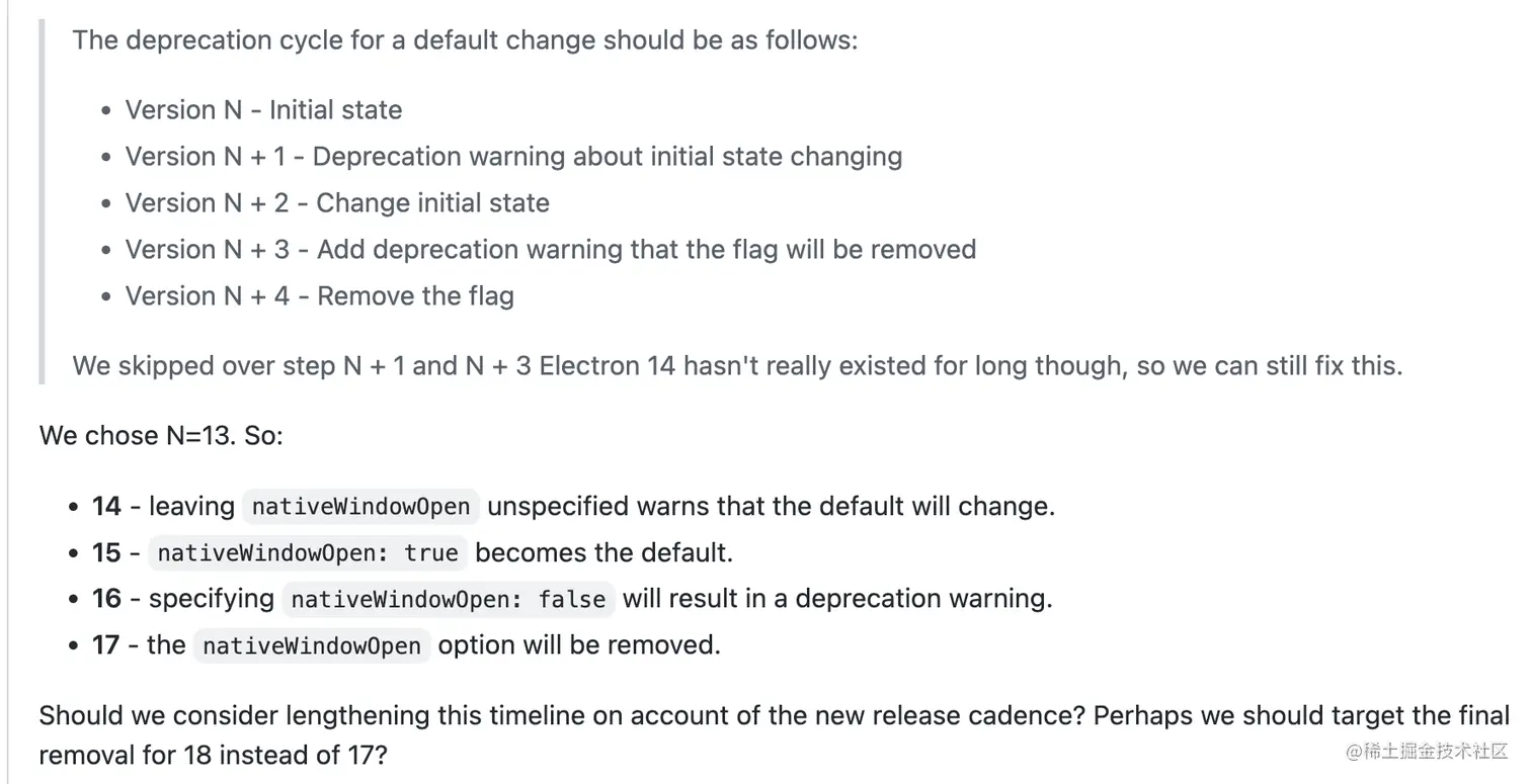 考虑到废弃 nativeWindowOpen 这个属性影响广泛,electron 团队遵循了以下周期,还是挺值得参考的: