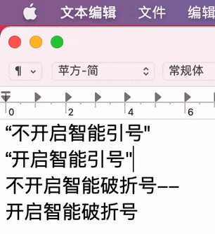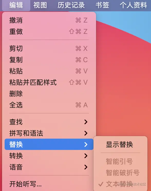 支持 「编辑」-「替换」菜单,目前支持「显示替换」、「智能引号」、「智能破折号」、「文本替换」。