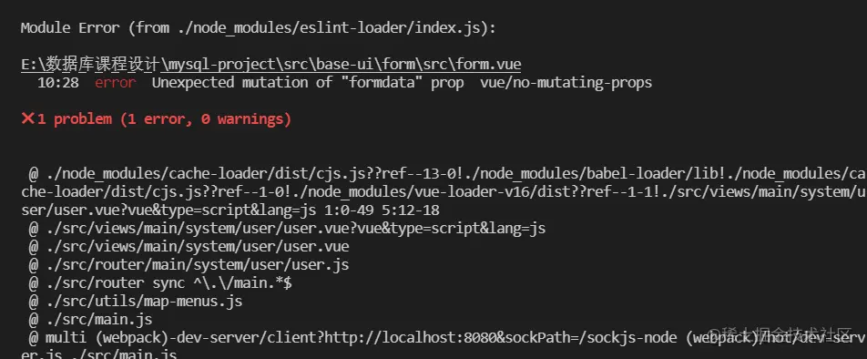 error的报错信息大致是 eslint并不支持formdata的prop修改。也就是对我子组件引用父组件的数据会做出修改的提前报错。居然不给我修改props的权利?我先百度了一下,通过"vue/no-mutating-props": "off"给关闭了。这是最直接的办法,虽然说vue不接受直接改变props的数据去双向绑定。