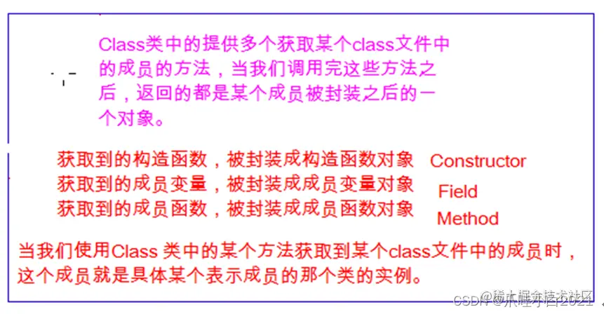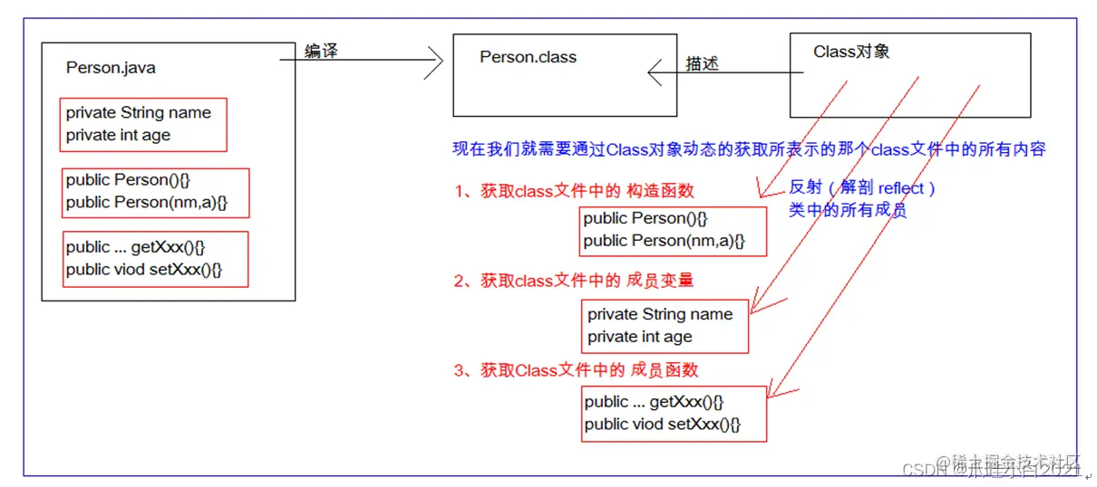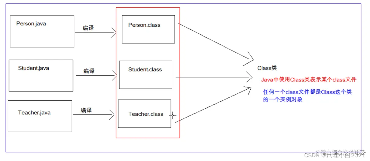 Class 类的实例表示正在运行的 Java 应用程序中的类和接口。枚举是一种类,注释是一种接口。每个数组属于被映射为 Class 对象的一个类,所有具有相同元素类型和维数的数组都共享该 Class 对象。基本的 Java 类型(boolean、byte、char、short、int、long、float 和 double)和关键字 void 也表示为 Class 对象。Class类它可以表示Java中的任何内容(类、接口、枚举、注解、数组、基本类型、void类型、成员变量、成员函数、构造函数、静态代码块、构造代码块等)。Class 没有公共构造方法。Class 对象是在加载类时由 Java 虚拟机以及通过调用类加载器中的 defineClass 方法自动构造的