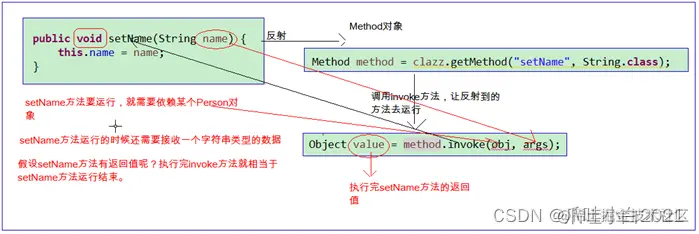 Object value = method.invoke(obj, "赵四"); //这句代码就是在调用反射到Person类中的setName方法
