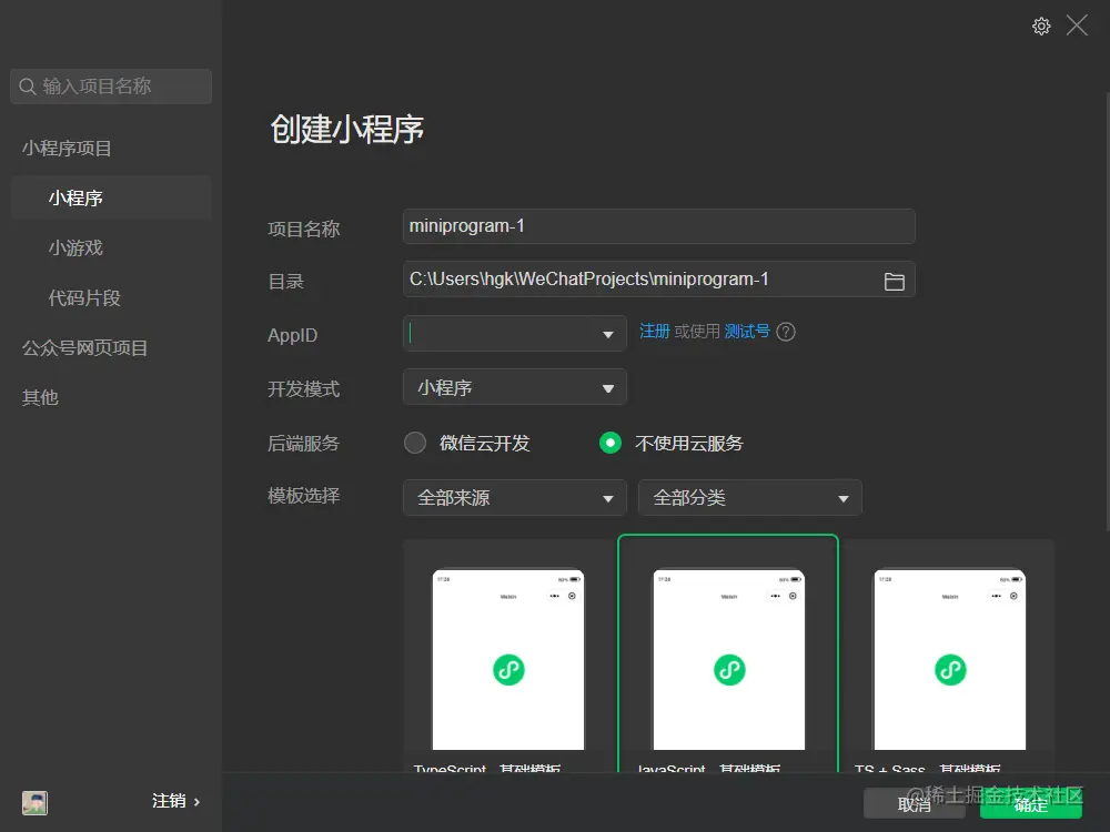 后端服务选不使用云服务,模板选JavaScript模板,这些根据自己的需求来选