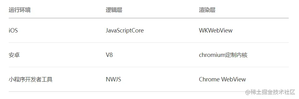 网页开发者需要面对的环境是各式各样的浏览器,PC 端需要面对 IE、Chrome、QQ浏览器等,在移动端需要面对Safari、Chrome以及 iOS、Android 系统中的各式 WebView 。而小程序开发过程中需要面对的是两大操作系统 iOS 和 Android 的微信客户端,以及用于辅助开发的小程序开发者工具,小程序中三大运行环境也是有所区别的。