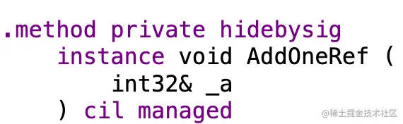 ref将值类型参数按引用传递,而非值传递,可以理解成将a的地址传进方法中,这点在IL代码就有体现出来,下图是将那2个方法转成IL代码,可以看出AddOne 参数是 int32 _a,值传递会copy出一个新变量,即使修改也影响不到原变量;而AddOneRef 参数是int32& _a,是传地址,因此对_a进行修改会影响a,他们其实就是同一个变量。
