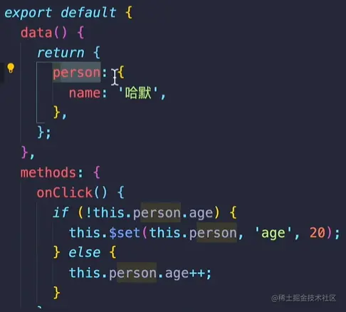 就比如这个,person中只有name这个数据,使用this.$set(this. person, 'age ' , 20),就在person中增加了age这个属性了