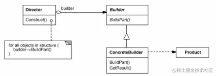 4 Product:表示被构造的复杂对象。ConcreteBuilder创建该产品的内部表示并定义它的装配过程,包含定义组成部件的类,包括将这些部件装配成最终产品的接口。