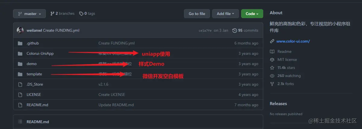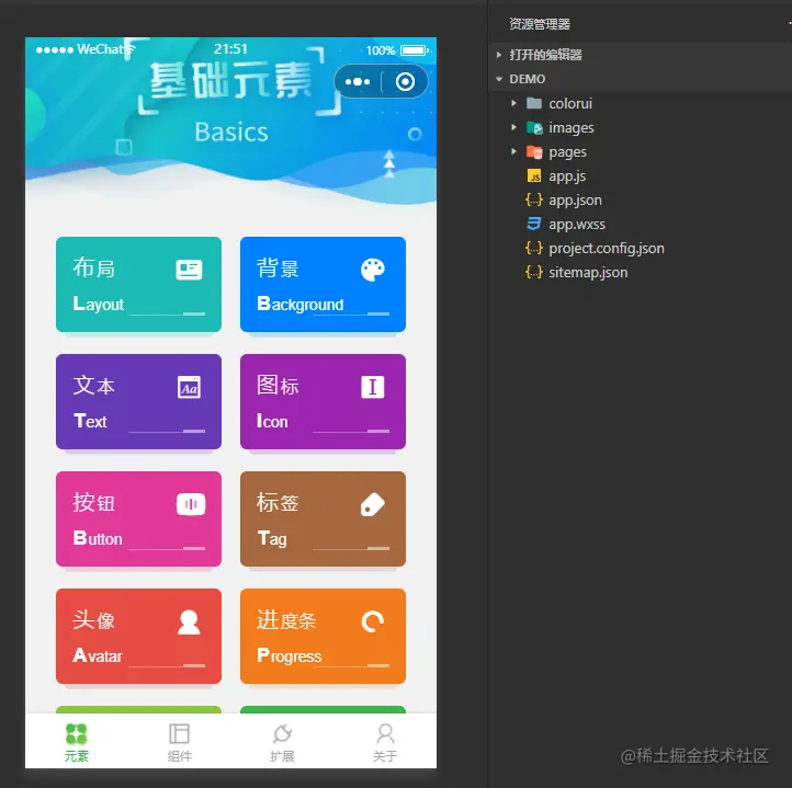 地址:github.com/weilanwl/Co… 由于官网打不开,我们可以从GitHub上进行下载,colorUI官方提供了样式demo,我们可以直接在本地运行,可以看每个组件的效果。