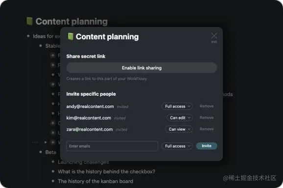 极其简单的共享权限让您可以控制谁可以看到什么,并轻松与任何人协作。他们甚至不需要帐户即可查看或编辑项目。