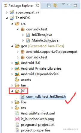 最后会在项目目录下,生成一个jni文件夹,里面生成了 .h 的c++头文件(需要在当前工程中刷新一下才能看到)。