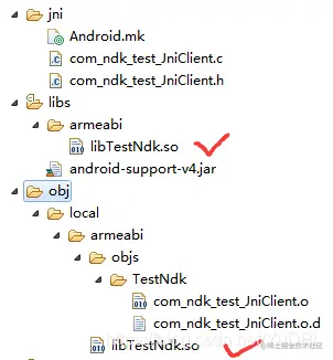 当编辑com_ndk_test_JniClient.c并保存后,刷新一下(刷新没有,就选中project然后clean一下工程试试),就可以看到TestNkd工程下的obj/local/armeabi目录下将自动生成libTestNdk.so库、libs目录下也会自动生成一个libTestNdk.so库,如下图: