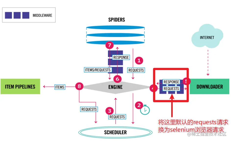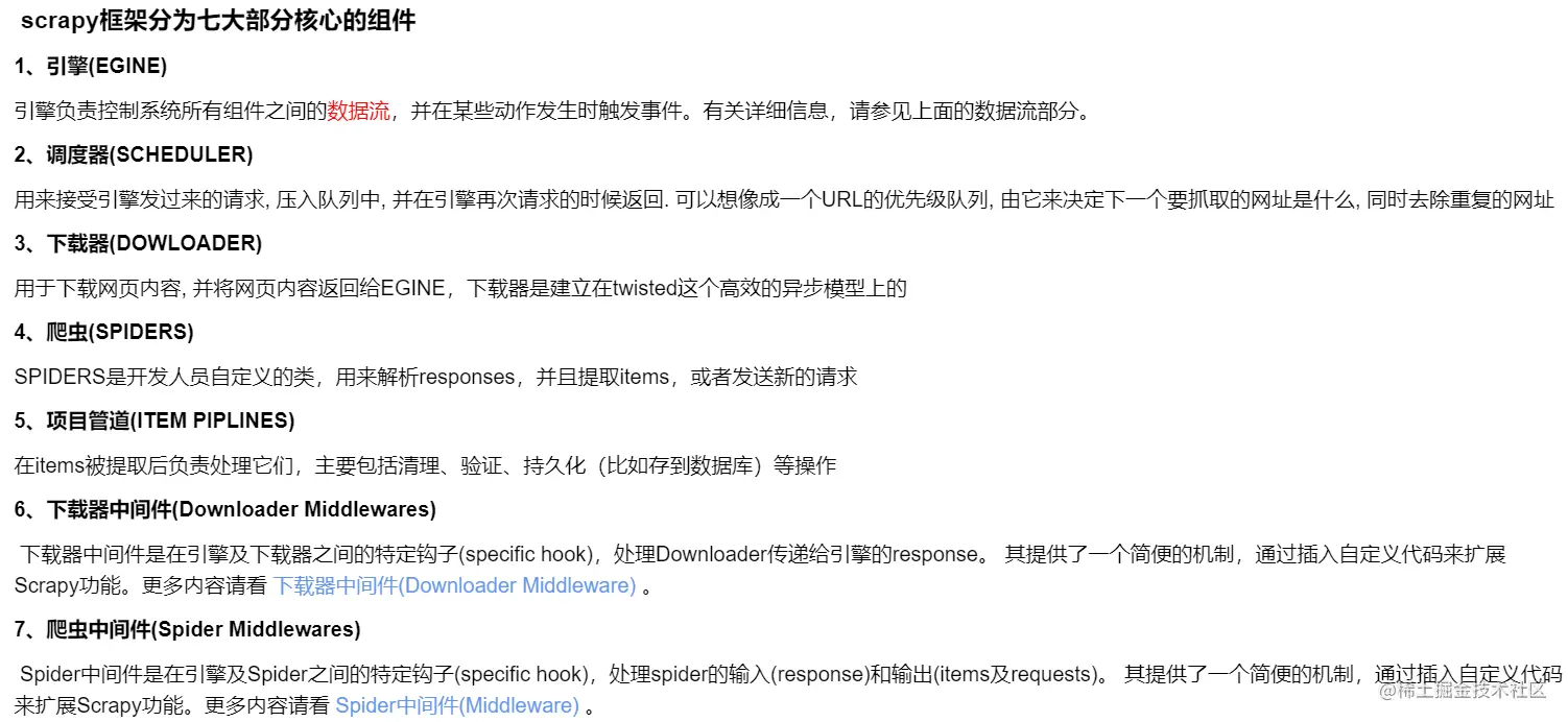 Scrapy Engine(引擎):Scrapy框架的核心部分。负责在Spider和ItemPipeline、Downloader、Scheduler中间通信、传递数据等。Spider(爬虫):发送需要爬取的链接给引擎,最后引擎把其他模块请求回来的数据再发送给爬虫,爬虫就去解析想要的数据。这个部分是我们开发者自己写的,因为要爬取哪些链接,页面中的哪些数据是我们需要的,都是由程序员自己决定。Scheduler(调度器):负责接收引擎发送过来的请求,并按照一定的方式进行排列和整理,负责调度请求的顺序等。Downloader(下载器):负责接收引擎传过来的下载请求,然后去网络上下载对应的数据再交还给引擎。Item Pipeline(管道):负责将Spider(爬虫)传递过来的数据进行保存。具体保存在哪里,应该看开发者自己的需求。Downloader Middlewares(下载器中间件):下载器中间件,位于引擎和下载器之间的钩子框架,主要是处理引擎与下载器之间的请求及响应。Spider Middlewares(Spider中间件):蜘蛛中间件,位于引擎和蜘蛛之间的钩子框架,主要工作是处理Spider输入的响应和输出的结果及新的请求。