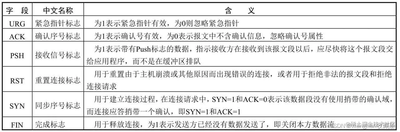 (5)标志位:URG、ACK、PSH、RST、SYN、FIN,共6个,每一个标志位都表示一个控制功能,具体含义如下表所示。