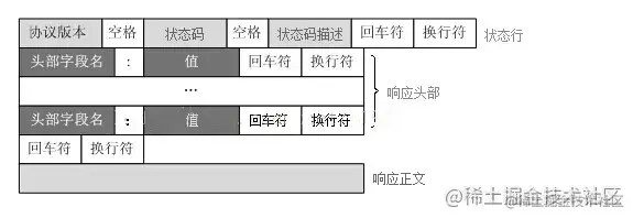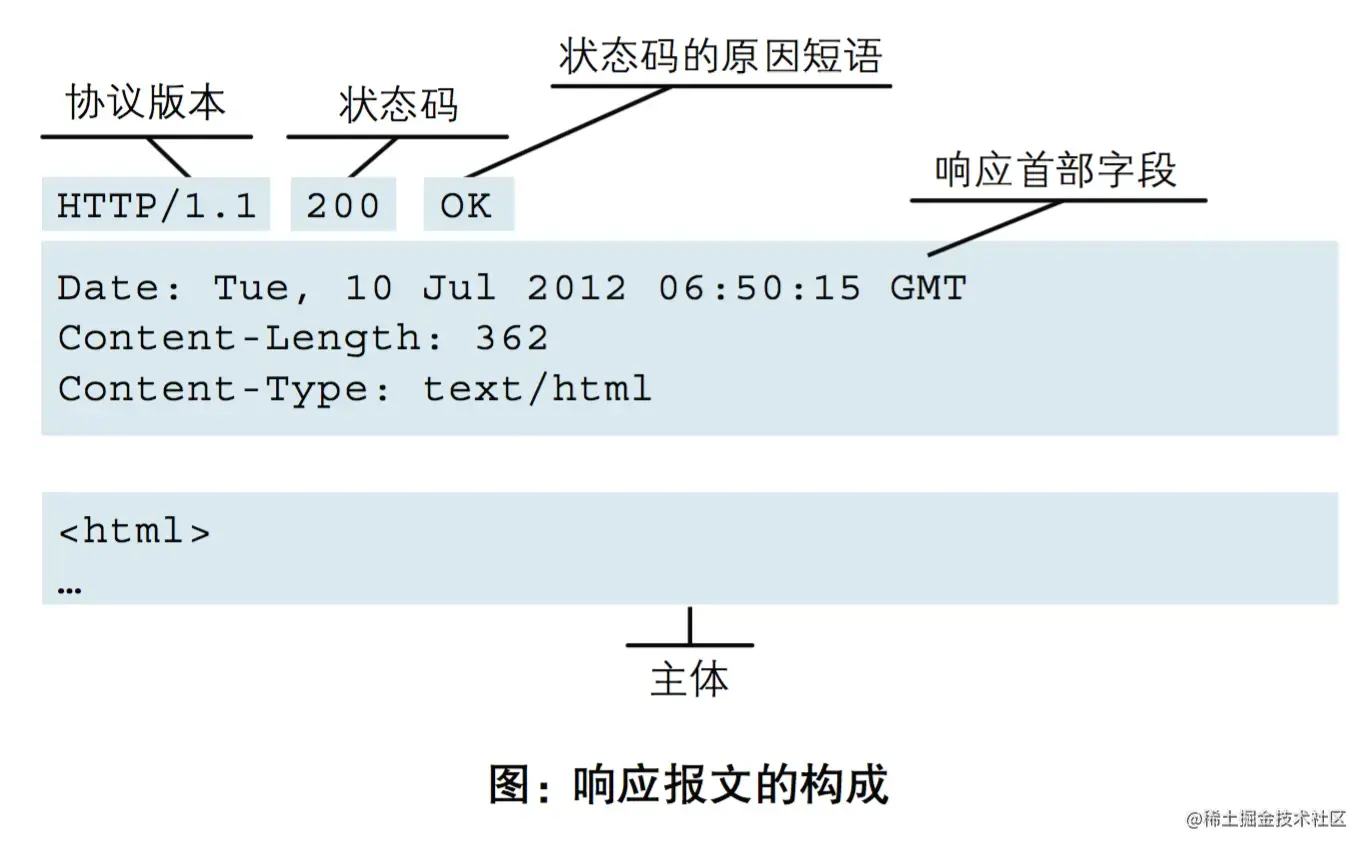 响应报文 是由状态行(协议版本、状态码)、响应首部(服务器名称、资源标识等)和内容实体(服务端返回的资源信息)构成。