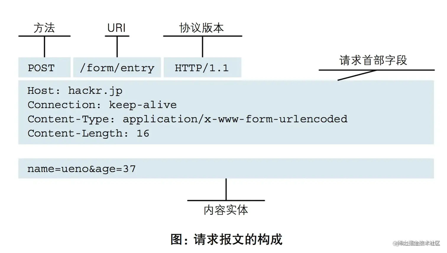 请求报文 是由请求行(请求方法、协议版本)、请求首部(请求URI、客户端信息等)和内容实体(用户信息和资源信息等,可为空)构成。
