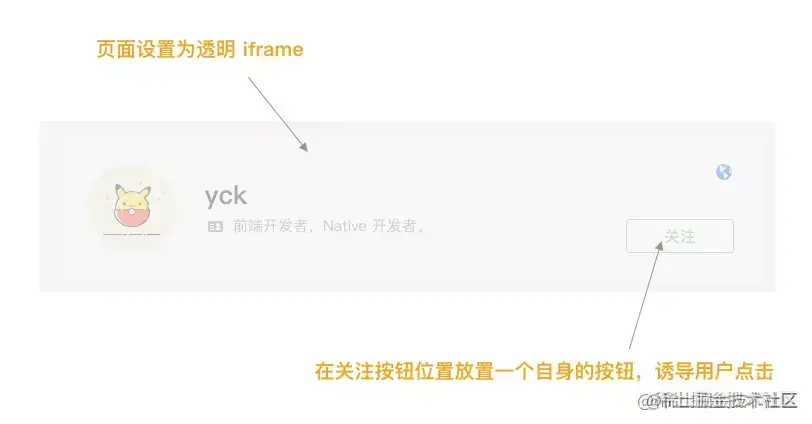 点击劫持是一种视觉欺骗的攻击手段。攻击者将需要攻击的网站通过 iframe 嵌入自己的网页中,并将 iframe 设置为透明,然后诱使用户在该页面上进行操作,此时用户将在不知情的情况下点击透明的iframe页面(偸yck大佬一张图会不会被抓┭┮﹏┭┮):