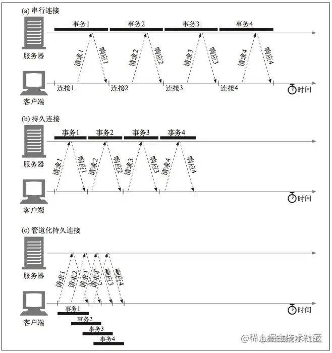 如图中(a):串行连接每次发起请求都必须建立新的tcp连接。