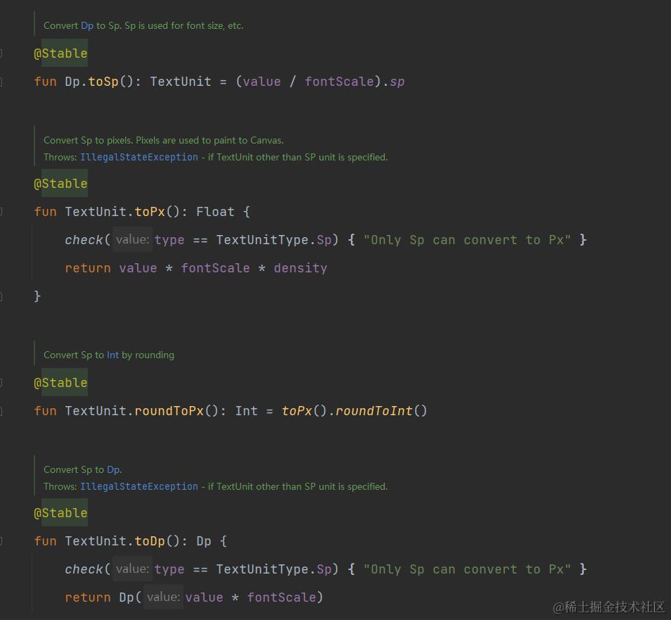 此外,Density 接口还定义了 fontScale 变量,这就很容易让人联想到 sp 单位了。实际上,Density 接口的确提供了多个方法,用来实现 dp、px、sp 等单位之间的互相转换