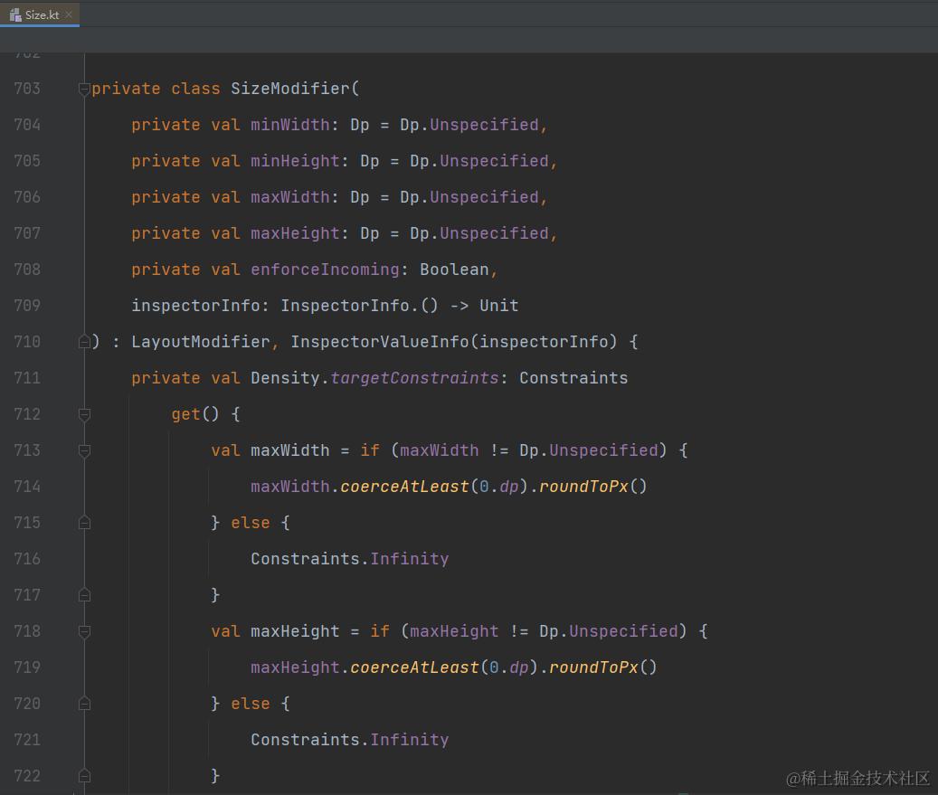 以 Modifier 的扩展函数 Modifier.size(width: Dp, height: Dp) 为例,其宽高大小均是 Dp 类型,在生成尺寸约束 Constraints 时,也是将 dp 转换为 px 后使用,对应 Dp.roundToPx() 方法