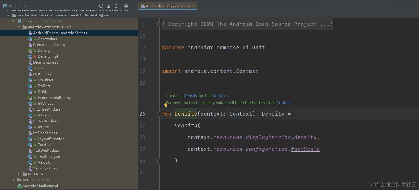 通过一步步查找 Density 接口的实现类,最终可以定位到 AndroidDensity.android 类,Jetpack Compose 就是在这里通过 Context 来获取对应的 density 和 fontScale