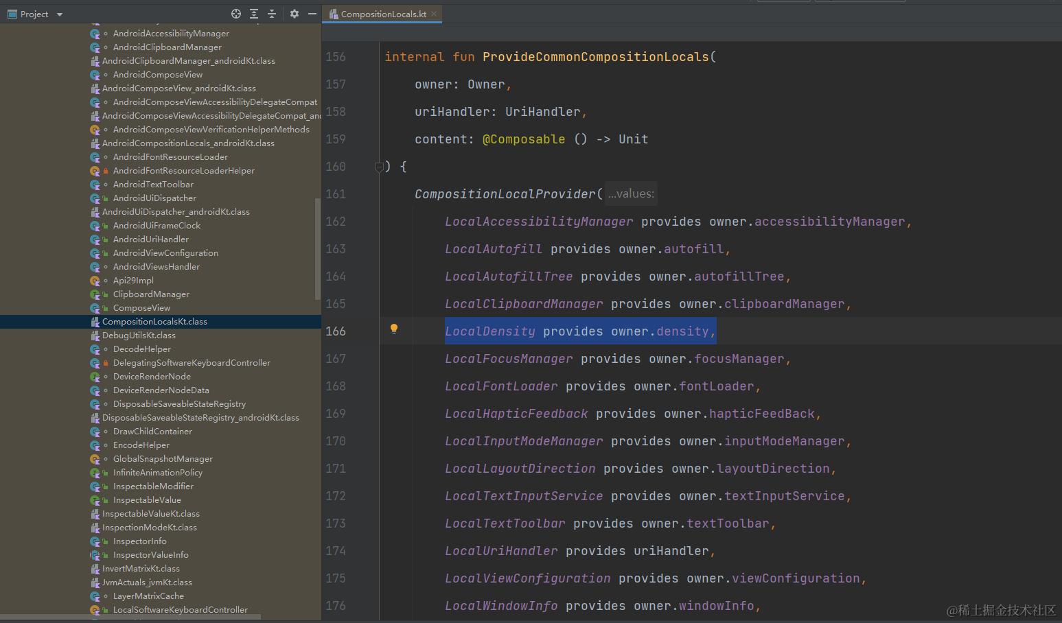 此外,看过一些 Jetpack Compose 内部源码的同学应该知道,连接 Compose 和 View 体系之间的桥梁是 AndroidComposeView 类,而 AndroidComposeView 就通过 fun Density(context: Context) 方法来初始化其内部声明的 density 对象,CompositionLocals 类的 ProvideCommonCompositionLocals 方法又通过 LocalDensity 来将 AndroidComposeView 持有的 density 对象暴露给外部,从而使得框架内部和开发者均可以通过 LocalDensity.current 来获取到当前的 Density 对象,也即通过此方法拿到了 Android 系统的 density 和 fontScale 两个参数