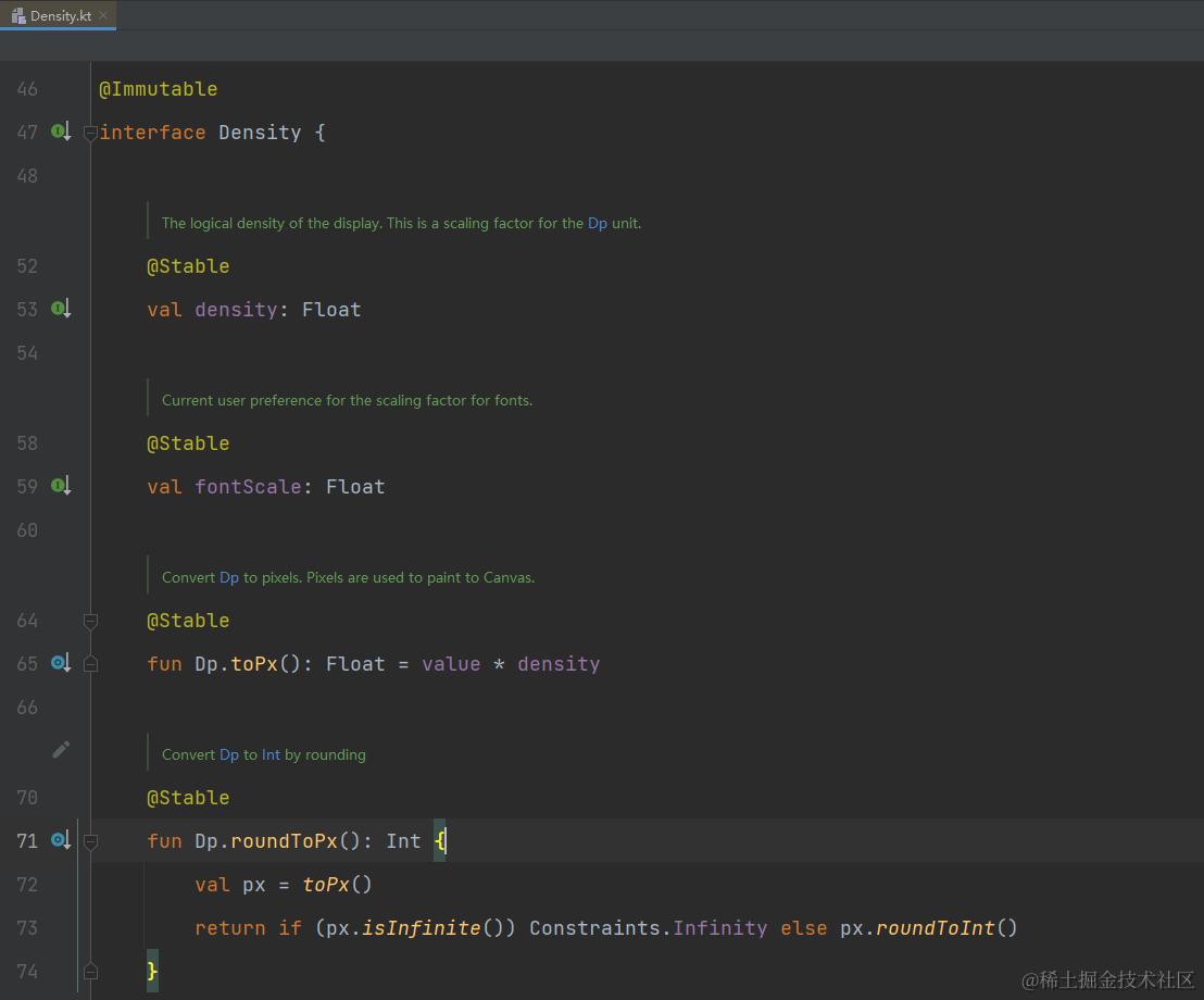 继续跟踪 Dp.roundToPx() 方法,可以看到 dp 和 px 之间的转换方式和原生 View 体系一样,也是按照 px = dp * density 的公式来进行转换的,density 值由 Density 接口来定义和提供