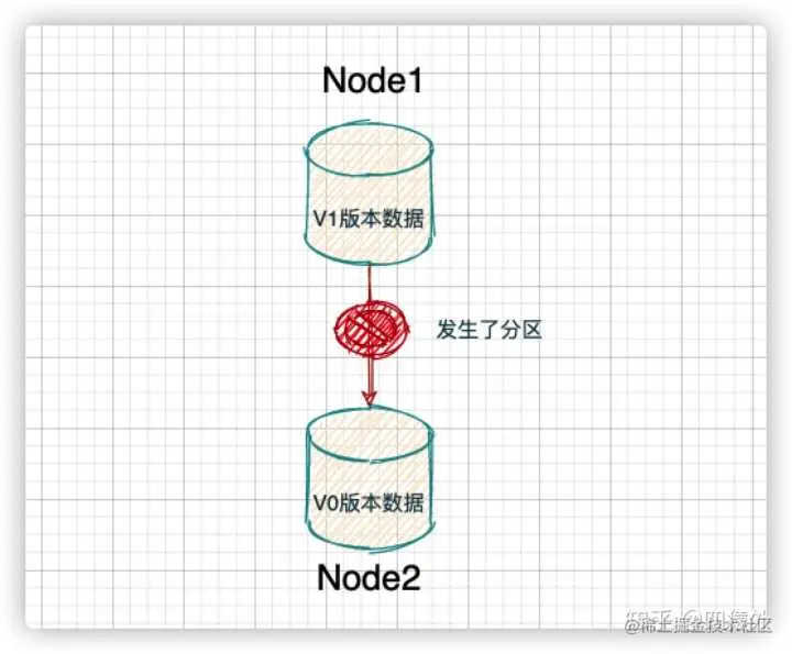 同样的例子,我们的分布式系统由三个节点组成,最近一次写请求想把值为 20 的数据写到三个节点上。但是,由于发生了分区问题,有一个节点通信故障,写请求写不过去,因此只有两个节点包含了值为 20 的数据。