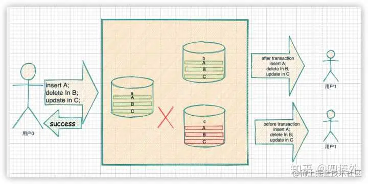 技术上我们对这种一个意图想做多件事的情况往往会包装成一个事务。当我们包装成一个事务以后,我们可能会通过先在 a 节点执行,然后去 b 节点执行,最后去 c 节点执行,等到都成功了,才会返回成功。
