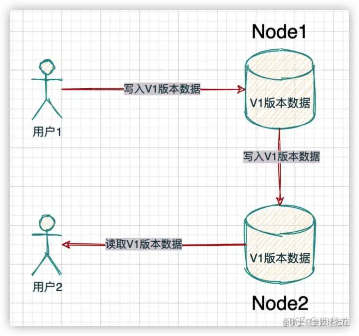 假设,我们的分布式存储系统有两个节点,每个节点都包含了一部分需要被变化的数据。如果经过一次写请求后,两个节点都发生了数据变化。然后,读请求把这些变化后的数据都读取到了,我们就把这次数据修改称为数据发生了一致性变化。