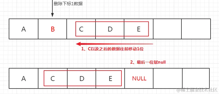移动数组数据,index+1 以及之后的数据往前移动一位,最后一位size-1赋值为null。