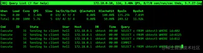 - 使用innotop连接数据库,进入交互式操作界面后,可输入不同工作模式的快捷键,进行切换工作模式。如输入大写的"Q"字母,进入交互界面的Query List工作模式。