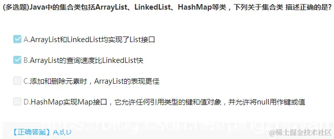 解释: ArrayList底层数组, LinkedList是链表 查询前者快, 增删后者快 D一般与泛型一起使用