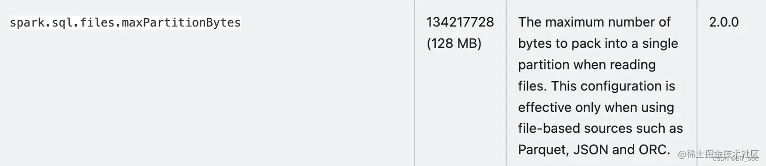 openCostInBytes 参数可以看作是 partition 的最小 bytes 要求,刚才试了一下不生效,现在试一下 partition 的最大 bytes 要求,maxPartitionBytes 参数规定了读取文件时要打包到单个分区中的最大字节数。此配置仅在使用基于文件的源(如Parquet、JSON和ORC)时有效: