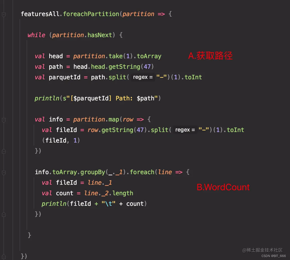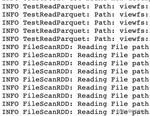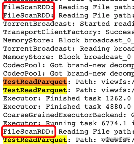 程序为了统计每个 parquet 内文件数量是否一致。由于 P[Executor] x Q[Core] = M [Parquet Num] ,所以认为每一个 Task 处理一个 Parquet,所以应该每一个日志都打印 Path + wordCount 结果即一一对应,但是实际操作发现 Path + wordCount 存在一对多的情况,遂开始排查。