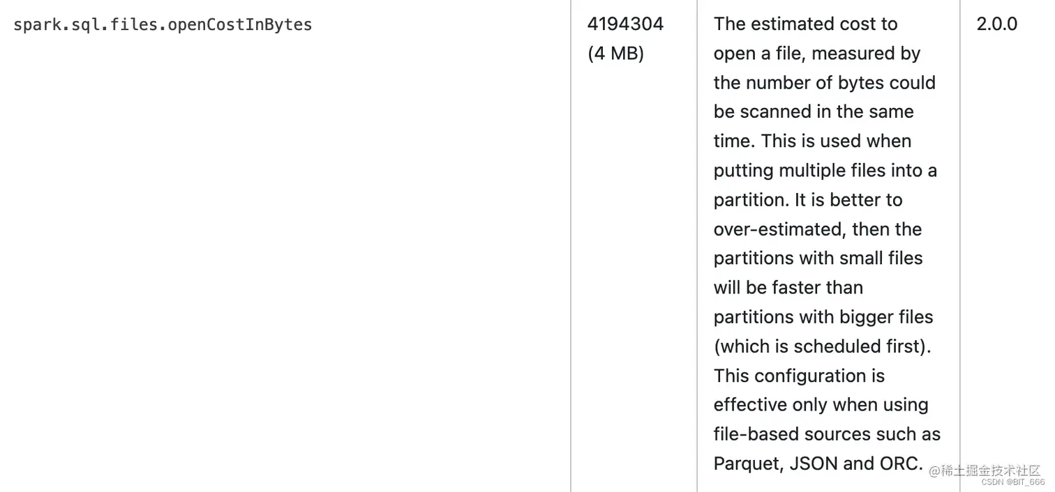 既然是因为 partition 合并导致了 Task 和 Parquet 的日志没有一一对应,接下来就得找一下 Spark.sql.files 的相关参数了,看看调整后能否一一对应,首先找到了 spark.sql.files.openCostInBytes,浅翻译一下: