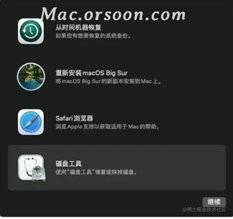 intel Mac:开机后立即按住Command和R,直至看到苹果标志或其他图像;M1 Mac:长按电源键直到屏幕出现“正在载入启动项”。之后选择“选项”,然后点按“继续”。从实用工具窗口中,选择“磁盘工具”,然后点按“继续”。